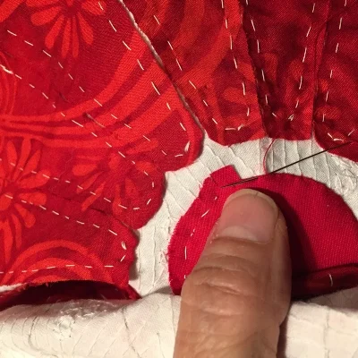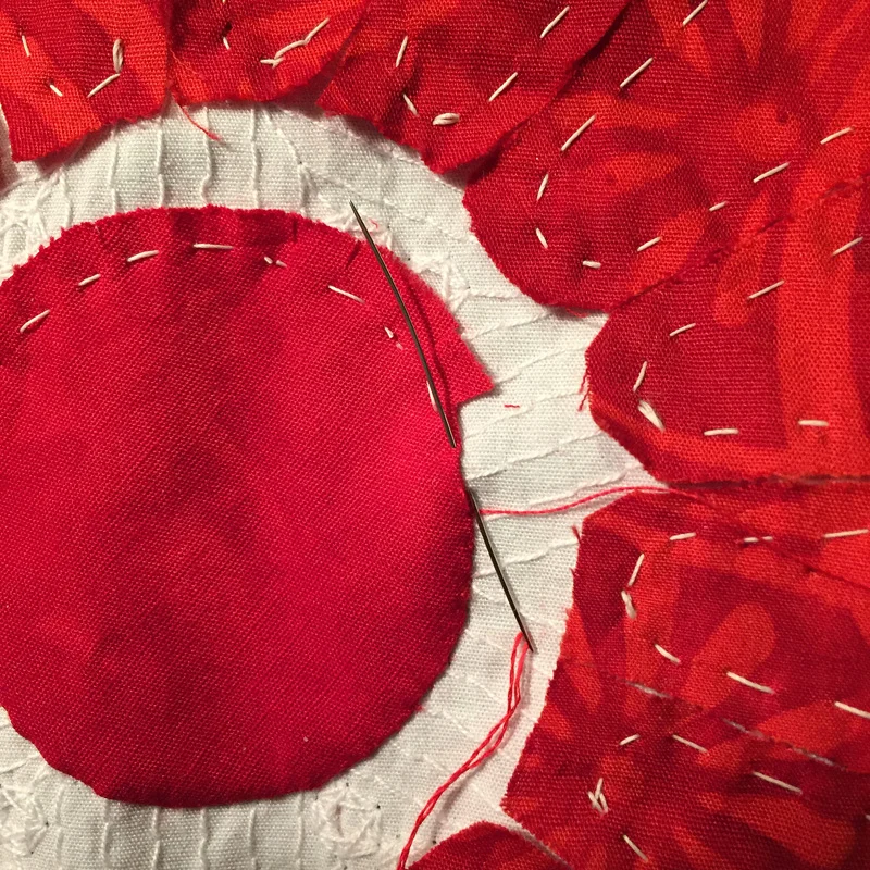 My 1 - 1/2" red circle was basted with stitches that were about 1/4" long and about 1/4" apart.