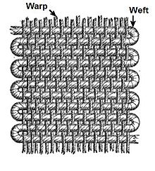 In weaving, the weft (sometimes woof) is the term for the thread or yarn which is drawn through, inserted over-and-under, the lengthwise warp yarns that are held in tension on a frame or loom to create cloth. Warp is the lengthwise or longitudinal thread in a roll, while weft is the transverse thread. ( to learn more read "Warp and woof".)
