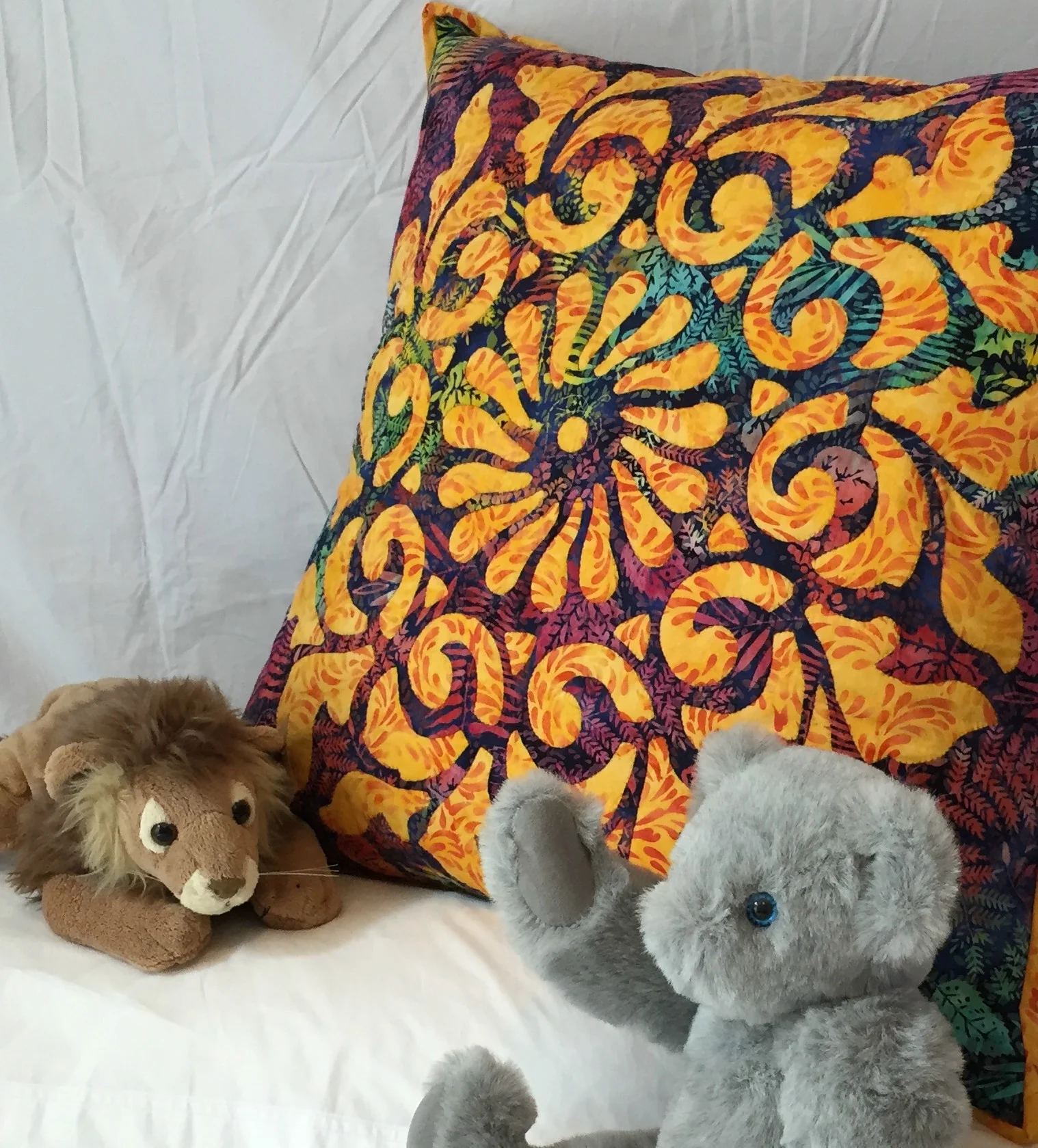 As I hand quilted Radiance (pic 5), I was struck with the idea of making this explosion of sunshine into a big, squishy inviting pillow. I got a 26" standard pillow form from my local Jo-Ann's and turned it into a rumpus pillow.